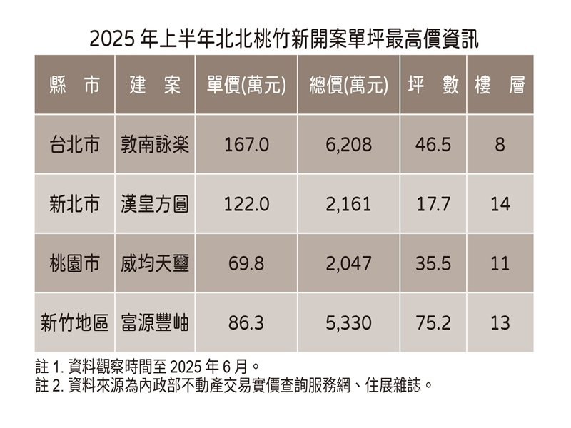 住展雜誌彙整今年上半年推出並已有實價揭露的北北桃竹新案交易最高單價資訊,台北市為大安區遠企商圈的「敦南詠楽」,8樓戶交易單價167萬元;新北市則是中和區捷運永安市場站生活圈的「漢皇方圓」,14樓戶小宅售出122萬元;桃園市是坐落青埔的「威均天璽」,11樓戶成交每坪69.8萬元;新竹地區為竹北市高鐵特區的「富源豐岫」,13樓戶賣在單坪86.3萬元。