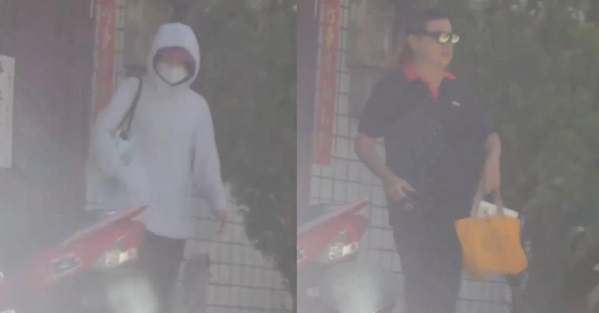 男子前腳剛走出家門,女子不到一分鐘就跟著出來,臉上是墨鏡口罩帽T,似乎深怕被認出。(圖/東森新聞)