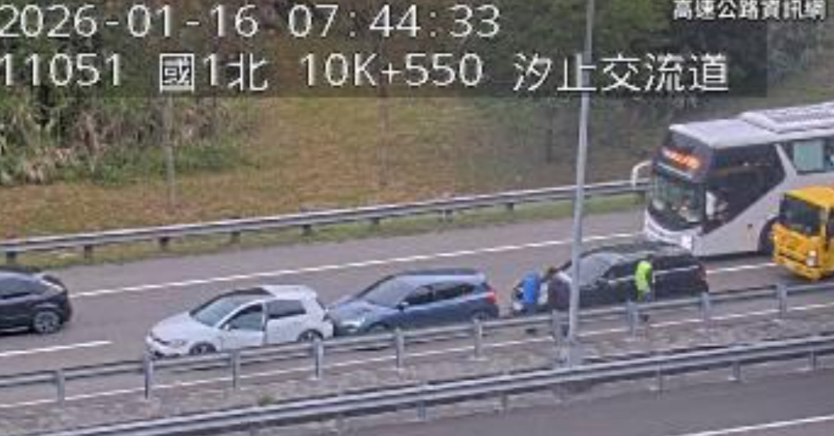 國道1號南向10.5公里汐止路段今(16日)07:41發生3車追撞事故,路段一度擁塞,時速約50公里左右。