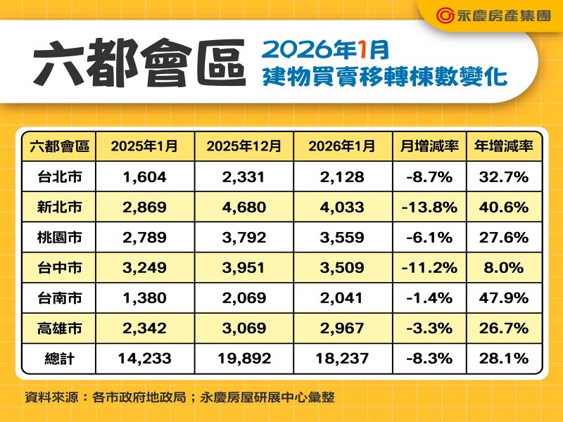 六都1月交易量月減8.3% 年增28.1%六都會區公布2026年1月「建物買賣移轉棟數」,六都交易量合計為14,226棟。永慶房屋研展中心副理陳金萍說明,1月六都建物買賣移轉棟數18,237棟,月減8.3%。其中台北市月減8.7%,新北市月減13.8%,桃園市月減6.1%,台中市月減11.2%,台南市月減1.4%,高雄市月減3.3%。陳金萍